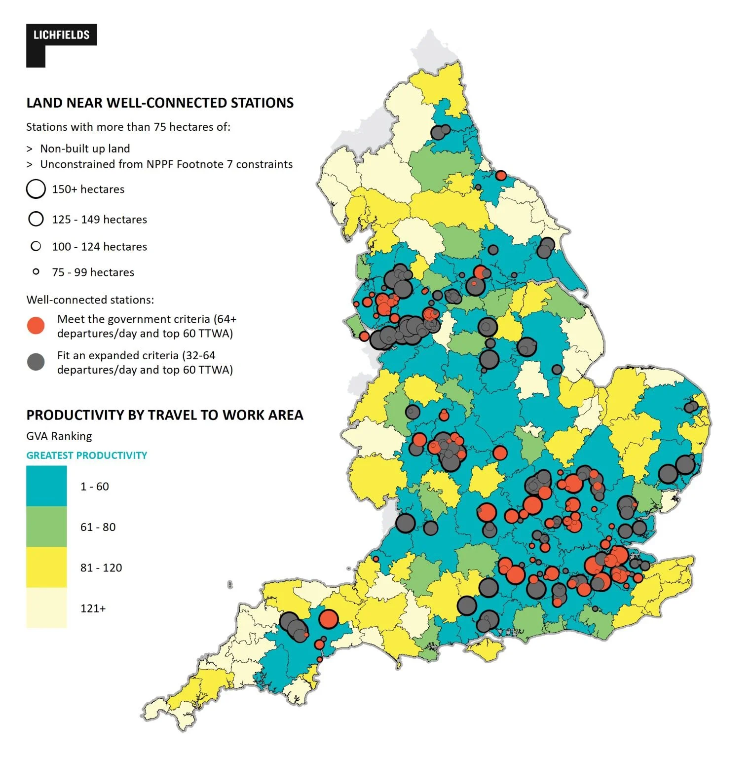 Lichfields’ best guess is that this policy as currently drafted could release 21,100 hectares of land to accommodate 630,000 homes. But - they estimate - if the criteria changes to stations with at least one service an hour (and potentially capable of seeing an increased service if demand increased) and in the top 60 TTWAs, the opportunity more than doubles to 1,314,000 homes. If the policy criterion was widened to the top 80 TTWAs by productivity, the policy could deliver 1.5 million homes.