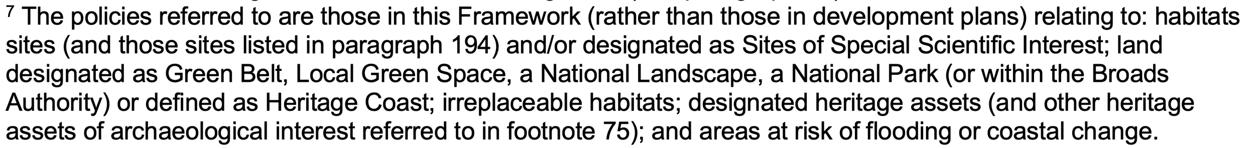 There remains the situation where the footnote 7 policy does not provide a clear reason for refusal (e.g. heritage policies). In that case, even if you’re in conflict with them, you have to strike an overall planning balance applying, among other things, the "tilted balance" at (4) above.