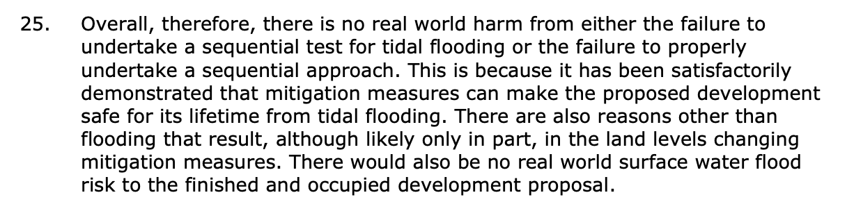 Why? Because it’s purist. It’s doctrinaire. It’s binary. It’s inflexible. It’s not interested in real world solutions, i.e. post-development. It’s not interested in whether a scheme can be safely delivered. Or a risk can be mitigated. Or balanced. Or solved. Or anything. As a policy mechanism, it only looks backwards. It’s just interested in the site as it is at the moment. Puddles and all. Mitigation-free. Devoid of solutions. And then it makes you go through the exercise - bizarre and illogical as it sometimes is - of trying to show the impossible, i.e. you’re the driest site in the county. Or the district. Or the town. Or wherever. What a strange state of affairs (i.e. why should you have to show that you’re not just acceptable, but also the driest site in the area to get a planning permission? What are we doing here? Does that mean that we have to develop sites 1 at a time, starting with the driest first and only then working our way wet-wards one permission at a time? Even in a world where there will be no actual risk of anything flooding with your development in place?).