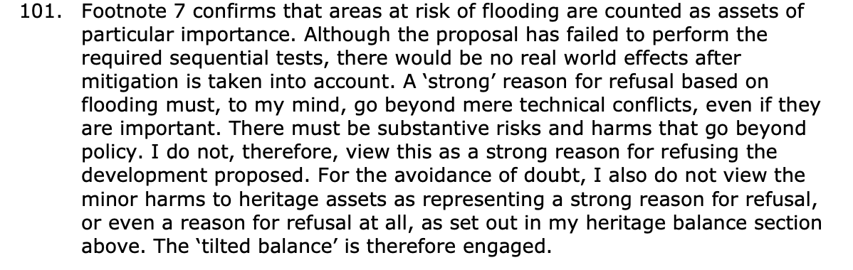 A so-called “clear” reason to refuse may just be another thing to weigh in the balance, along with everything else. See, for one example, the Redrow and Mead cases I wrote about here. Flood risk. Sequential testing. More of this in a moment. But one of the judge’s points (it was that Mr Justice Holgate again!) was that a failure to pass the sequential test (leading to the engagement of, and conflict with, a Footnote 7 policy) is something to be weighed in the wider planning balance. It’s not - or not necessarily - a show-stopper (NB for completeness an appeal against his decision to the Court of Appeal failed - I wrote about it here).